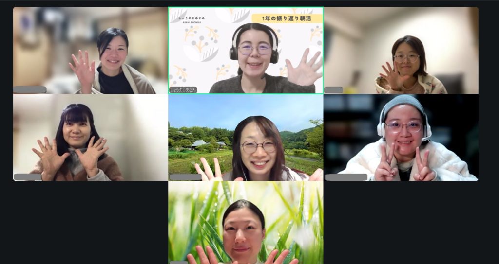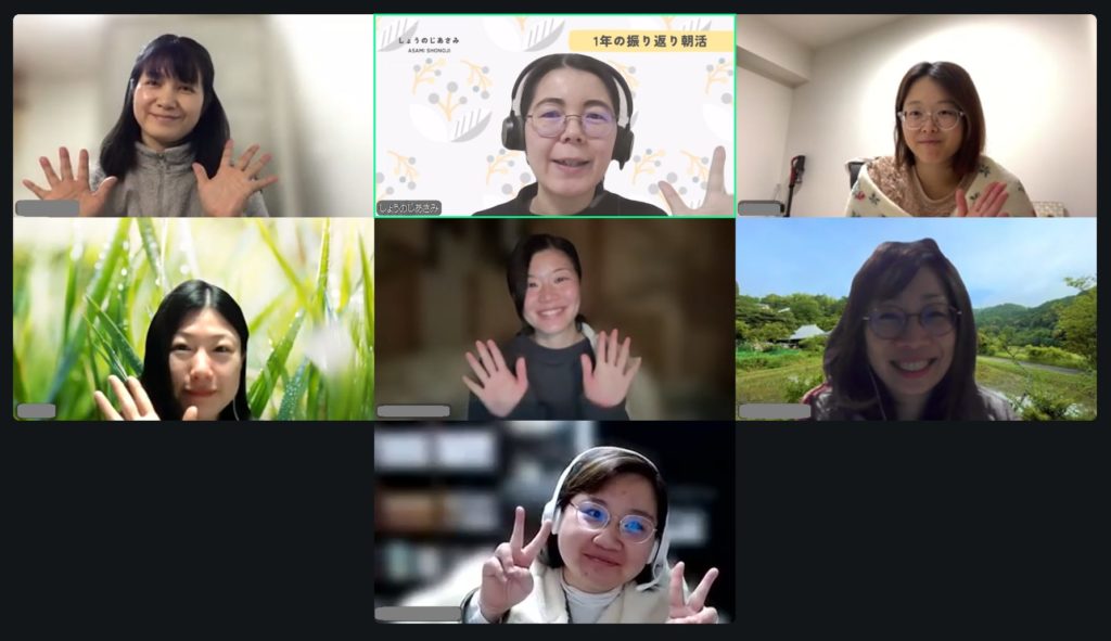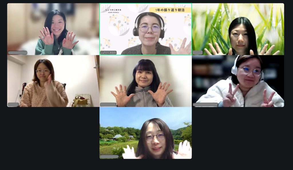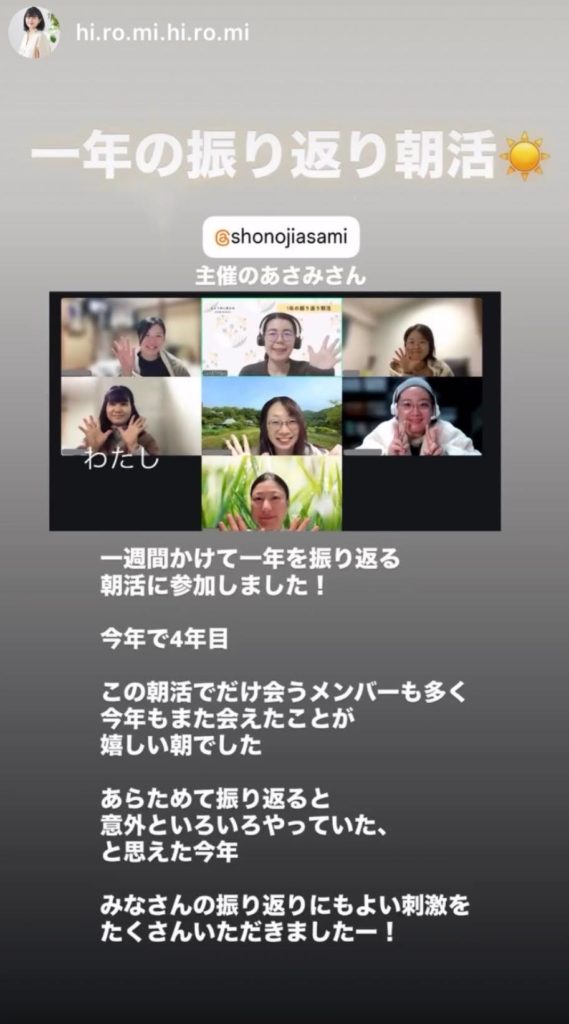 一人ではなかなか細かく振り返ることができないので参加しました。特別なことはしてこなかった一年というイメージでいましたが、朝活参加後は「意外といろいろやっていた!」に変わりました。人と話すというとてもシンプルな行動が、こんなにも心を暖め気付きを与えてくれるのかと、驚いた一週間でした。これは目的を持って集まってきたメンバーだからこそだったのかもしれません。あさみさんの持つ朗らかな空気が朝活の場を包み込んで、みんな安心して振り返りができたと思います。今年もありがとうございました!